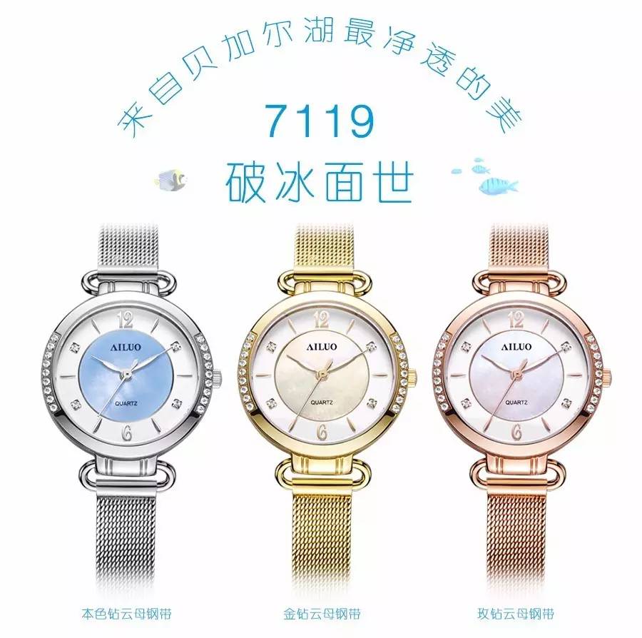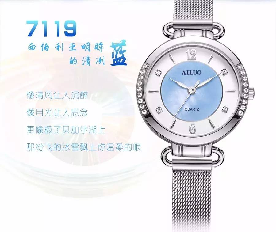 本款新品7119以静谧的贝加尔湖清冽蓝为创作灵感,风格丽雅时尚。平片蓝宝石镜面清澈透明。表圈两边各镶嵌9颗明亮水钻,清新中透露着小奢。2、4、8、10位的水钻以相交的方式璀现。纤巧的柳叶三针饰于圆润的表盘上,极简而流畅。正中心的珍珠贝宛若蓝玉置于冰面。复古别致的挂制扣表带,将几何美学耀入眼帘,沁人心脾中又透着丝滑金属质感令腕间优雅非凡。